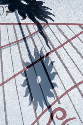 note sull'intervento | Lo gnomone è infisso fuori del quadrante e si inserisce in un motivo a stella in tre toni di azzurro. Il motivo a corridietro che compone la decorazione della cornice è stato richiesto dalla committenza e si ispira ai motivi decorativi della Gran Guardia Nuova, sede del Municipio di Verona. Quest'edificio venne progettato nel 1835 dall'Arch. Giuseppe Barbieri ed è inserito nel contesto architettonico di Piazza Bra. |